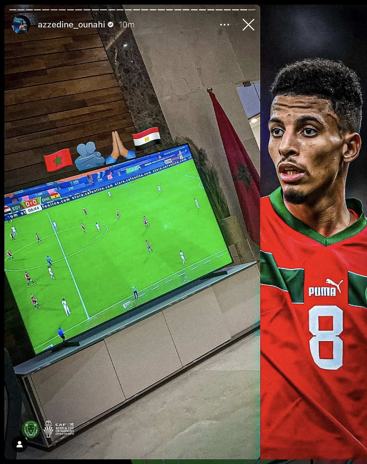 ونشر عز الدين أوناحى صورة عبر حسابه على أنستغرام خلال مشاهدته مباراة مصر وغانا وبجواره علما مصر والمغرب في إشارة إلى أن المنتخبين العربيين يد واحدة.