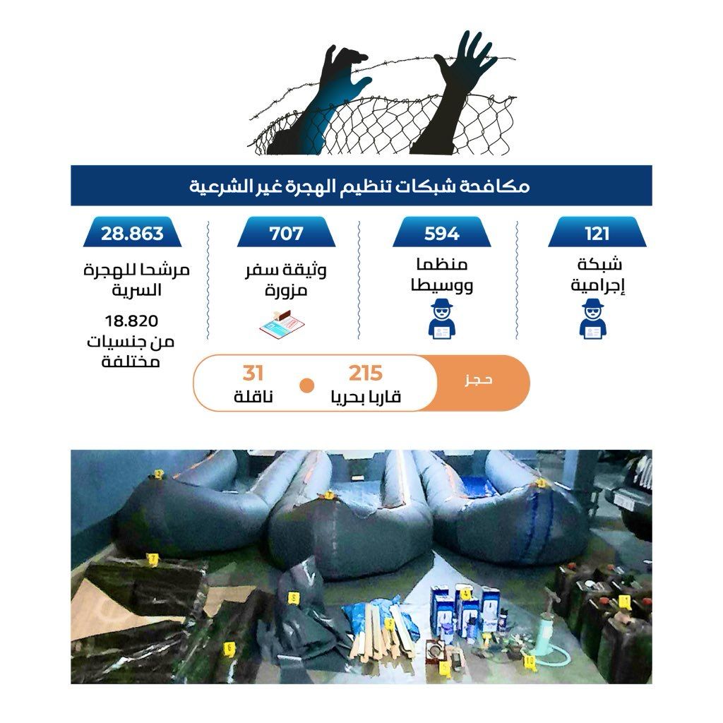 وأضافت المديرية، أن “وثائق السفر وسندات الهوية المزورة المحجوزة في إطار هذا النوع من القضايا بلغت 707 وثيقة، فضلا عن حجز 215 قاربا و31 ناقلة استخدمت في تنظيم عمليات الهجرة”.