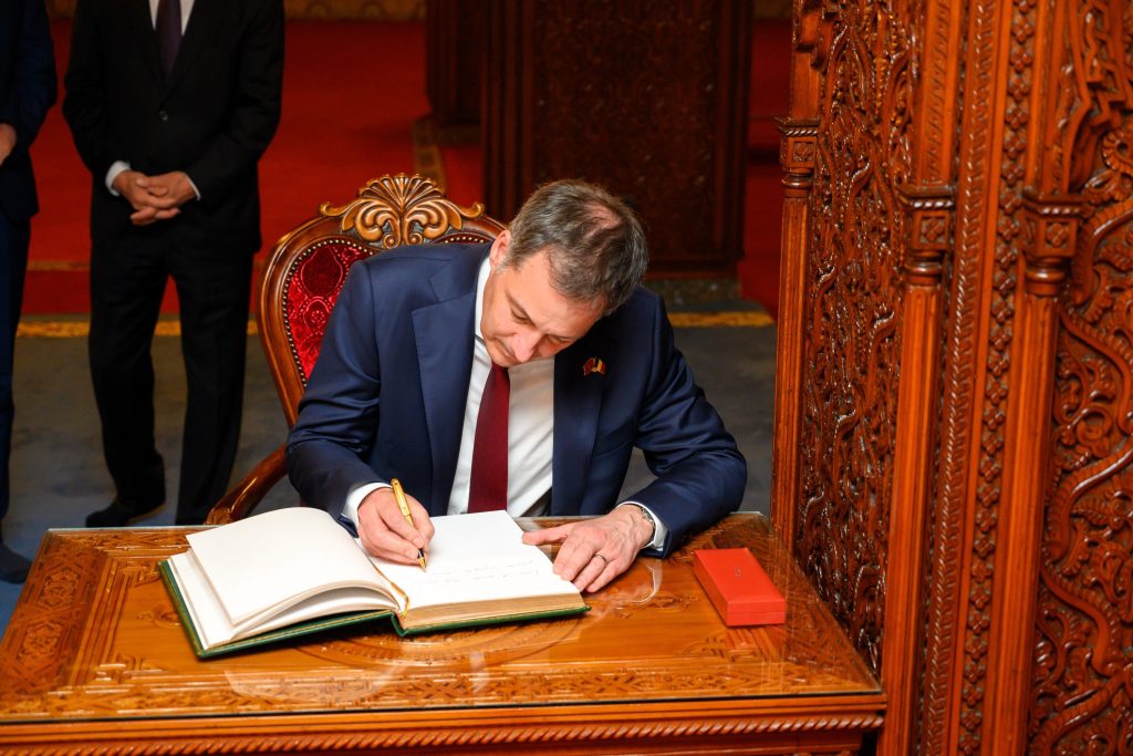 ووضع السيد دي كرو، الذي كان مرفوقا بوفد هام، ضم على الخصوص نائب رئيس الوزراء، وزير العدل، بول فان تيغشيلت، ووزيرة الداخلية، أنيليس فيرليندن، ووزيرة الشؤون الخارجية، حاجة لحبيب، وكاتبة الدولة لشؤون اللجوء والهجرة، نيكول دي مور، إكليلا من الزهور على قبري جلالة المغفور لهما، قبل أن يوقع في الدفتر الذهبي للضريح.