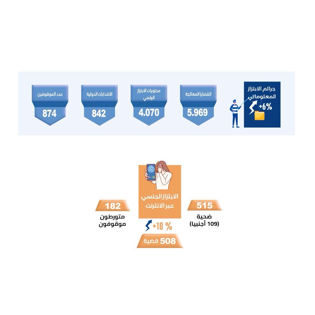وحسب التقرير، فقد بلغ عدد المحتويات ذات الطبيعة الابتزازية المرصودة 4070 محتوى إجرامي، وعدد الانتدابات الدولية الموجهة في هذه القضايا 842 انتدابا ، بينما بلغ عدد الموقوفين والمحالين على العدالة في هذا النوع من الجرائم 874 شخصا.