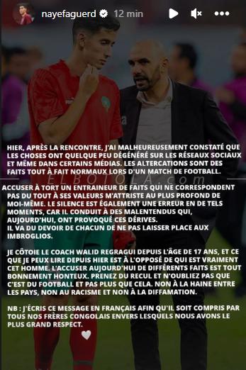 واختتم لاعب المنتخب المغربي نايف أكرد “أكتب هذه الرسالة بالفرنسية، ليتم فهمها من طرف جميع إخواننا الكونغوليين، والذين لدينا اتجاههم تقدير كبير”.