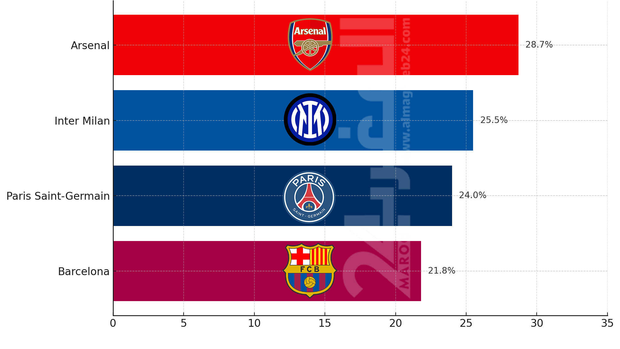 جاء إنتر ميلان في المركز الثاني بنسبة 25.5%، بعد تخطيه بايرن ميونخ في مواجهتين مثيرتين. أما باريس سان جيرمان، الذي عانى كثيراً لتجاوز أستون فيلا، فقد حظي بنسبة 24%.