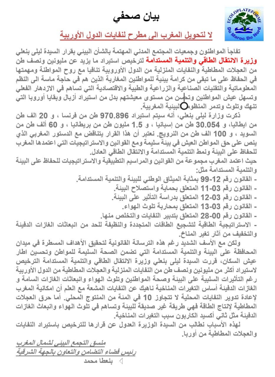 فضاء التضامن والتعاون بالجهة الشرقية، الذي يرأسه بنعطا محمد أصدر بياناً بعنوان «لا لتحويل المغرب إلى مطرح لنفايات الدول الأوروبية»، أكد فيه أن المغاربة فوجئوا بقرار وزارة الانتقال الطاقي والتنمية المستدامة بالسماح باستيراد أكثر من مليوني طن من النفايات المنزلية والعجلات المطاطية من الدول الأوروبية.